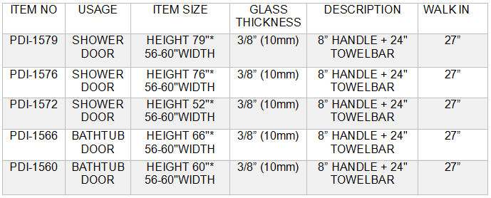 FEATURES : 24" TOWEL BAR & 8" HANDLE , 10MM TOUGHENED GLASS (ANSI) ,STAINLESS STEEL PARTS, REVERSIBLE FOR BOTH SIDES OPENINGS