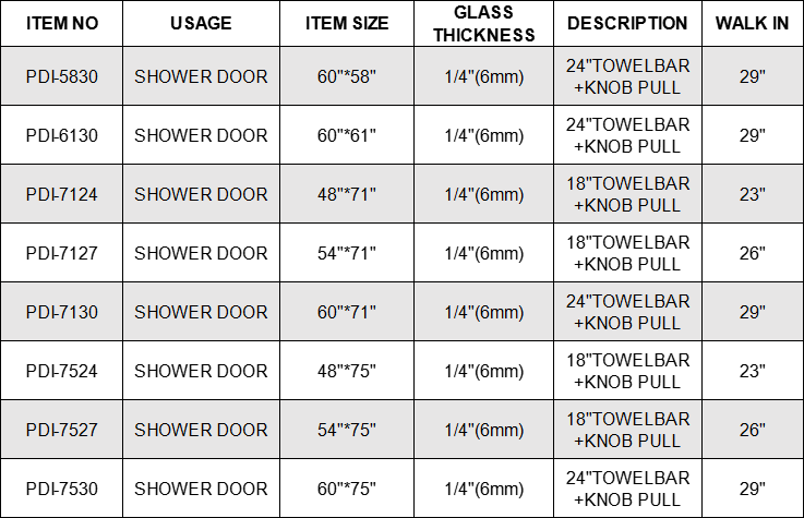 PDI-7130: CLASSIC SHOWER DOOR CLEAR GLASS FOR MODERN LOOK FOR YOUR BATHROOM. 6MM (1/4)" TOUGHENED GLASS WITH ANSI CERTIFICATION. ALUMINIUM PARTS WITH MIRROR CHROME FINSIH RUST RESISTANCE.PVC ANTI SPLASH SLEEVES TO AVOID WATER SPILL.EASY TO INSTALL COMPLETE KITS & GLASS PANELS.
